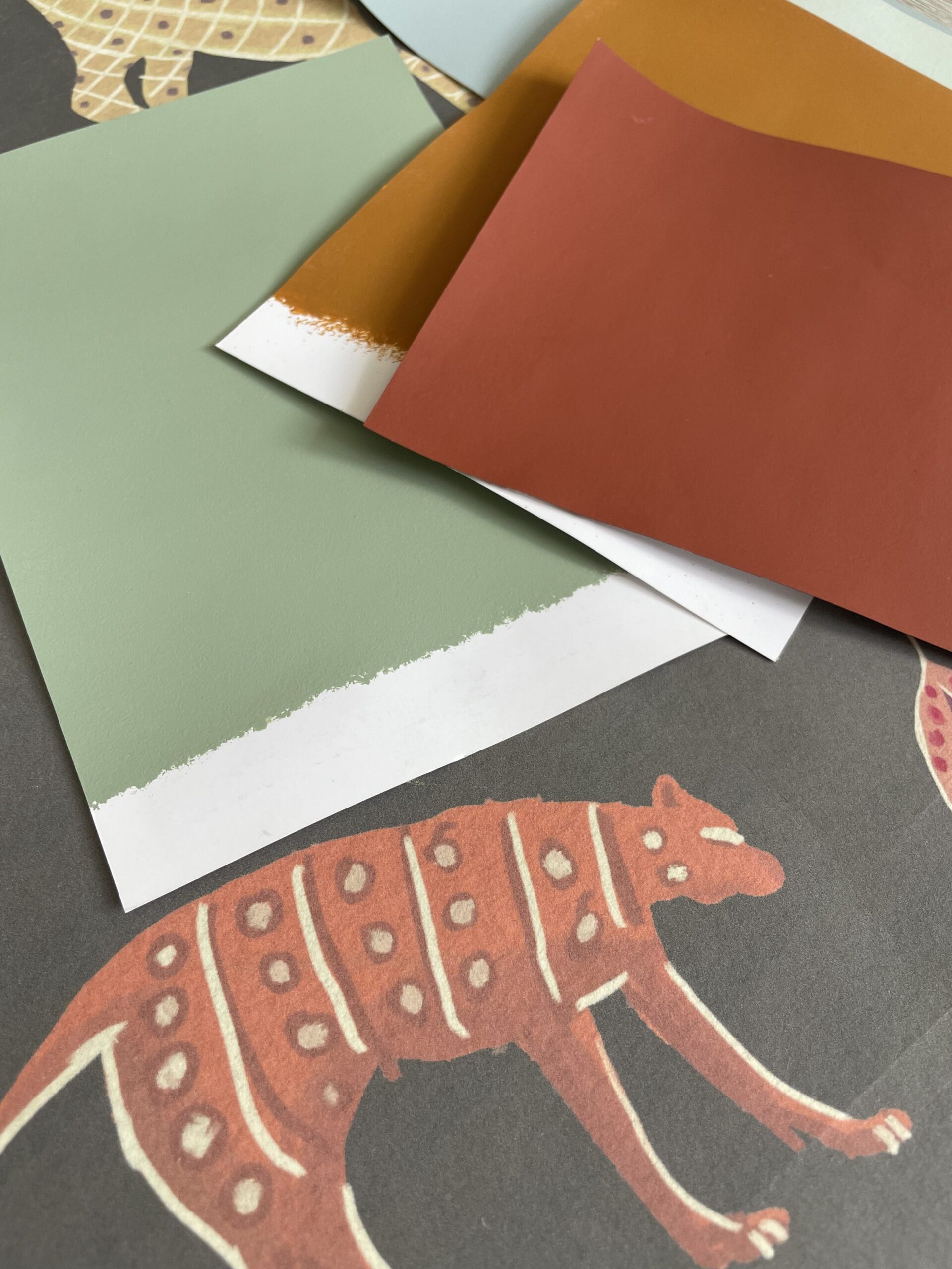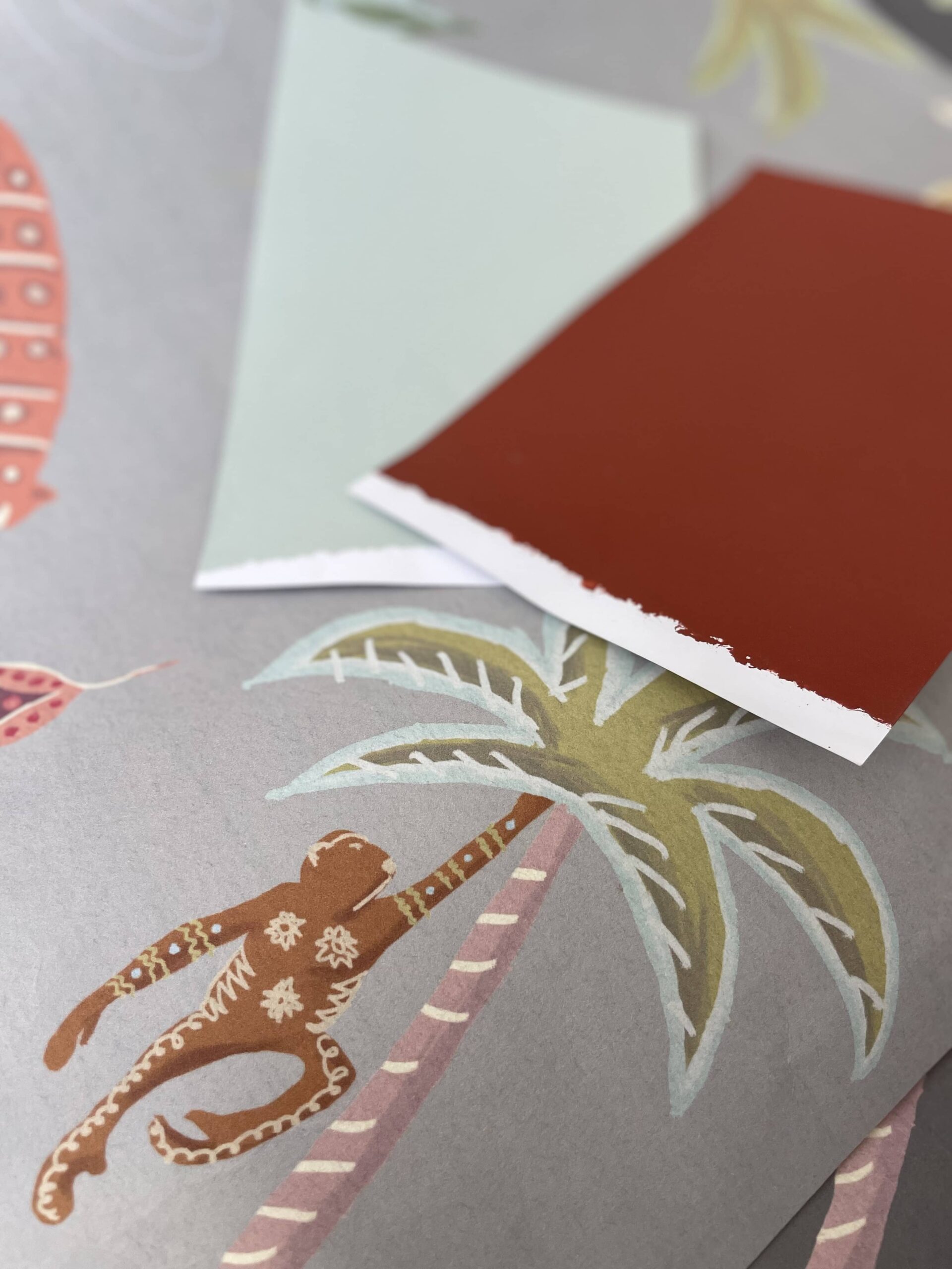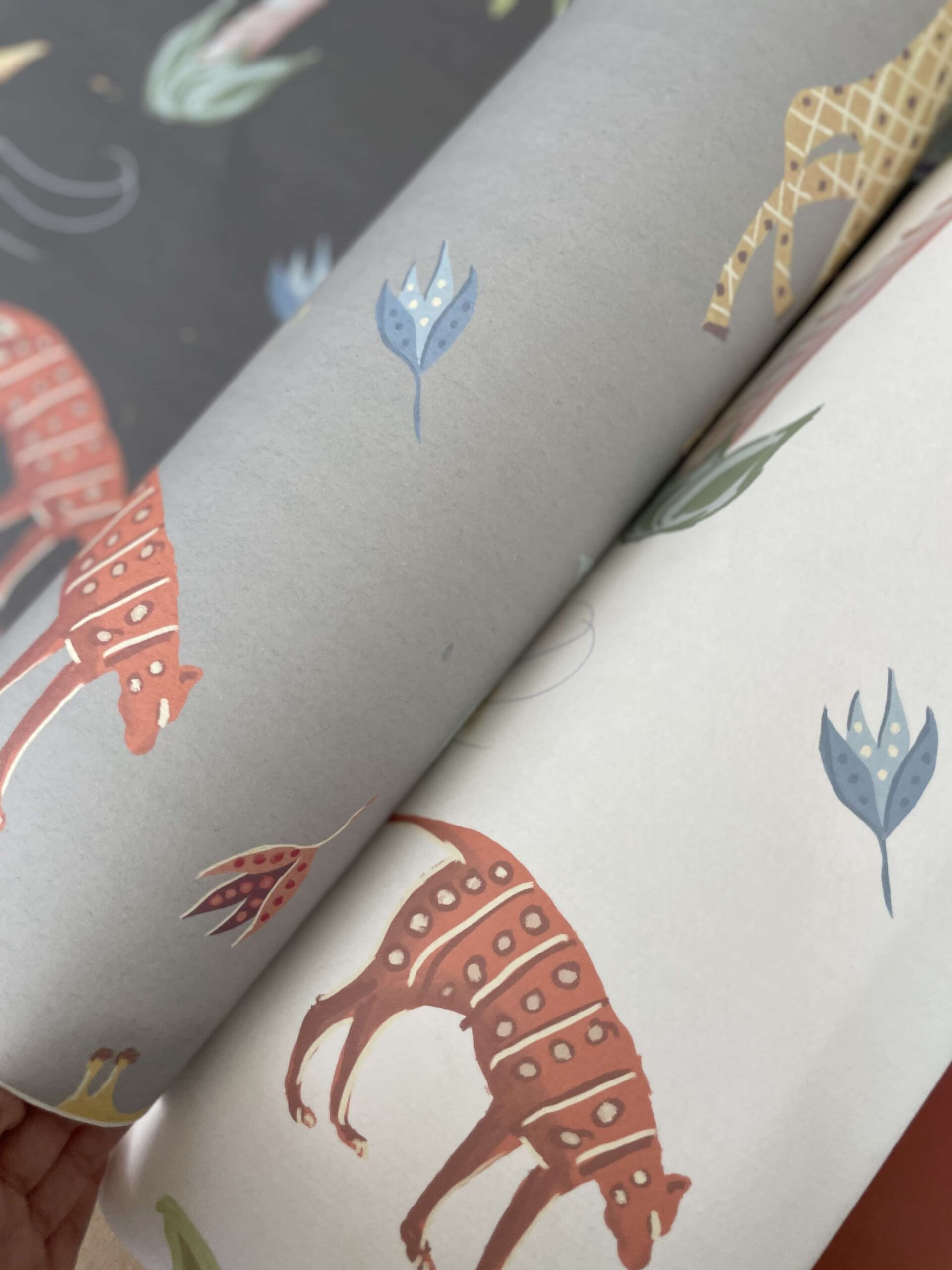 Nuestro papel más infantil y divertido, palmeras, jirafas, monos, aves  de colores…. Un papel pintado con pinceladas de acuarela que crearán  en un abrir y cerrar de ojos un ambiente moderno. Disponible en tres colores.